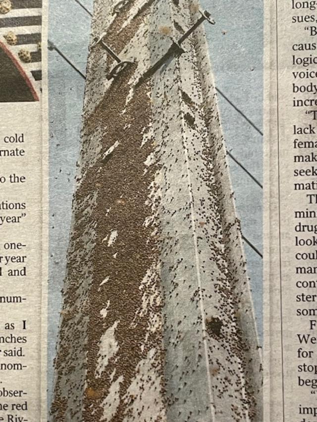 here you see a small portion of the ladybirds swarming onto a "stobie pole" one of many hundreds across Australia that carry our electrical wires from here to there and back.
